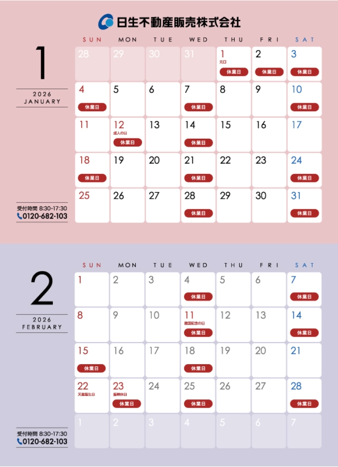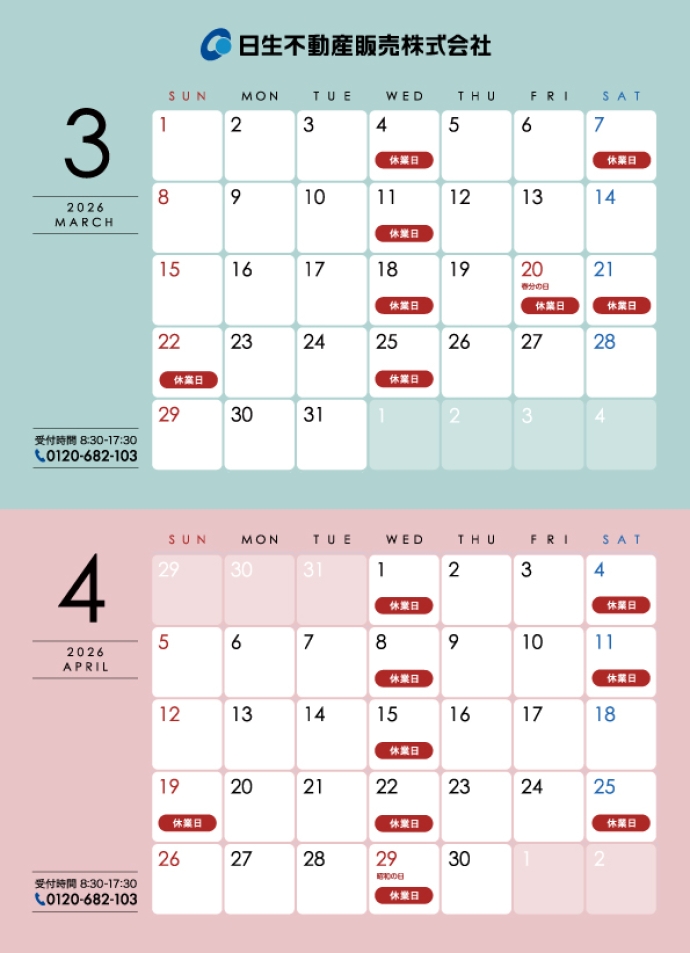 なお、分譲地担当者(サン・クレーク)および日生不動産(株)とは休業日が異なります。